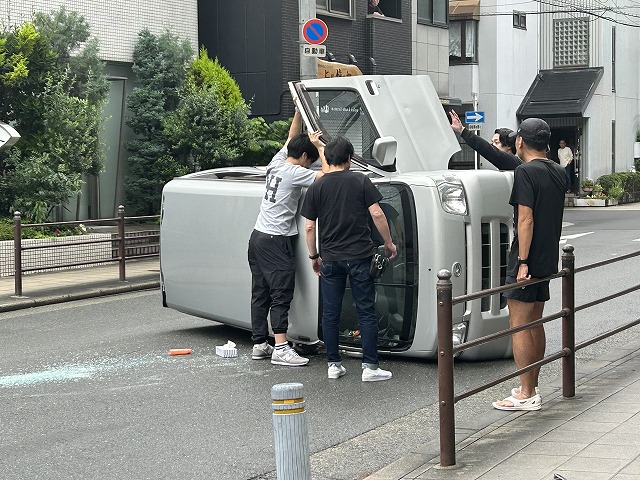 横転した車の運転手さんを救出中でした
