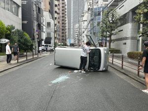”んん?? 車 ひっくり返ってるんか?”