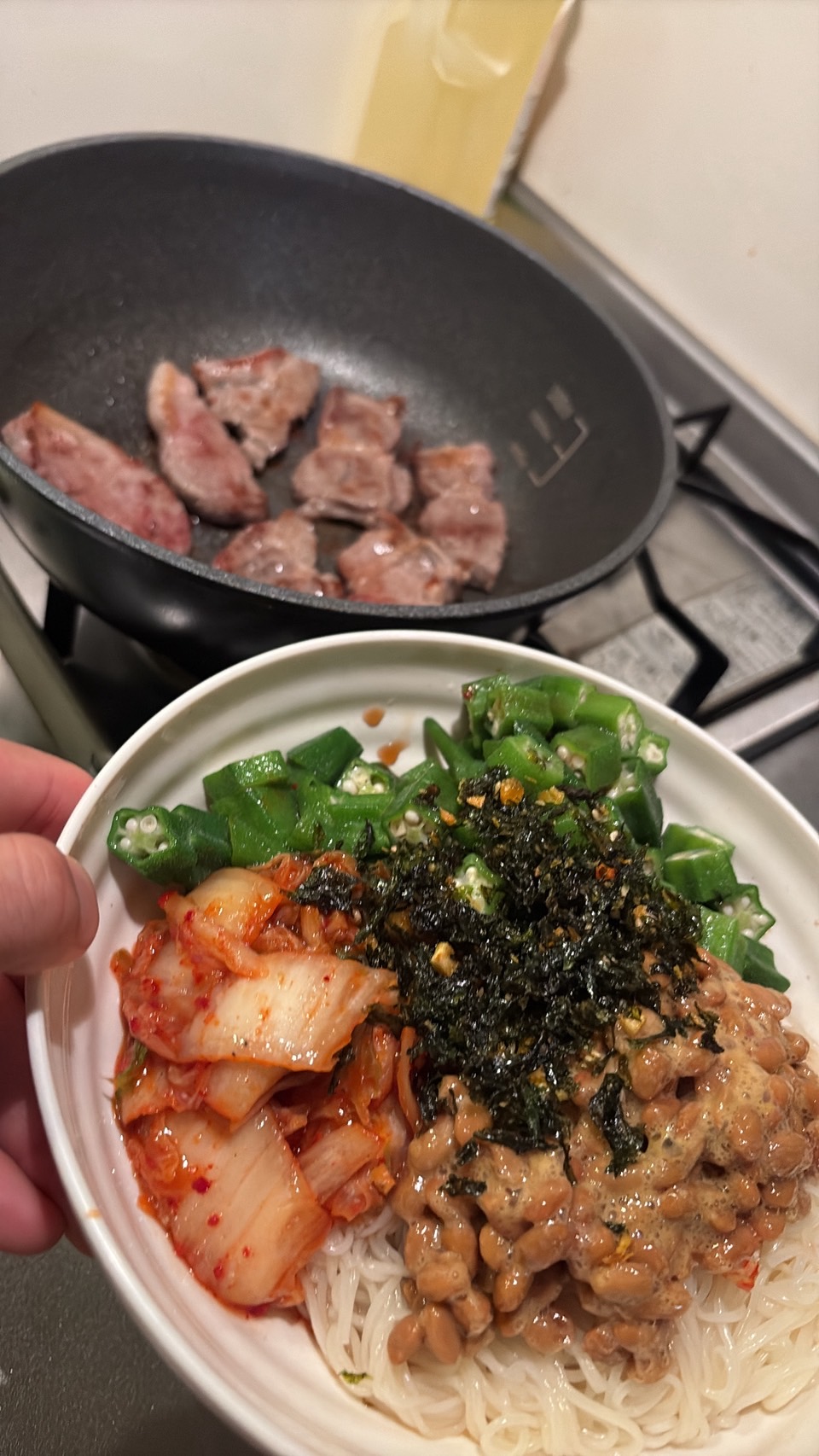 トッピングには、先日会社で行ったBBQの際に余った豚肉の焼き肉も添えて、ちょっと豪華な一皿に仕上がりました。