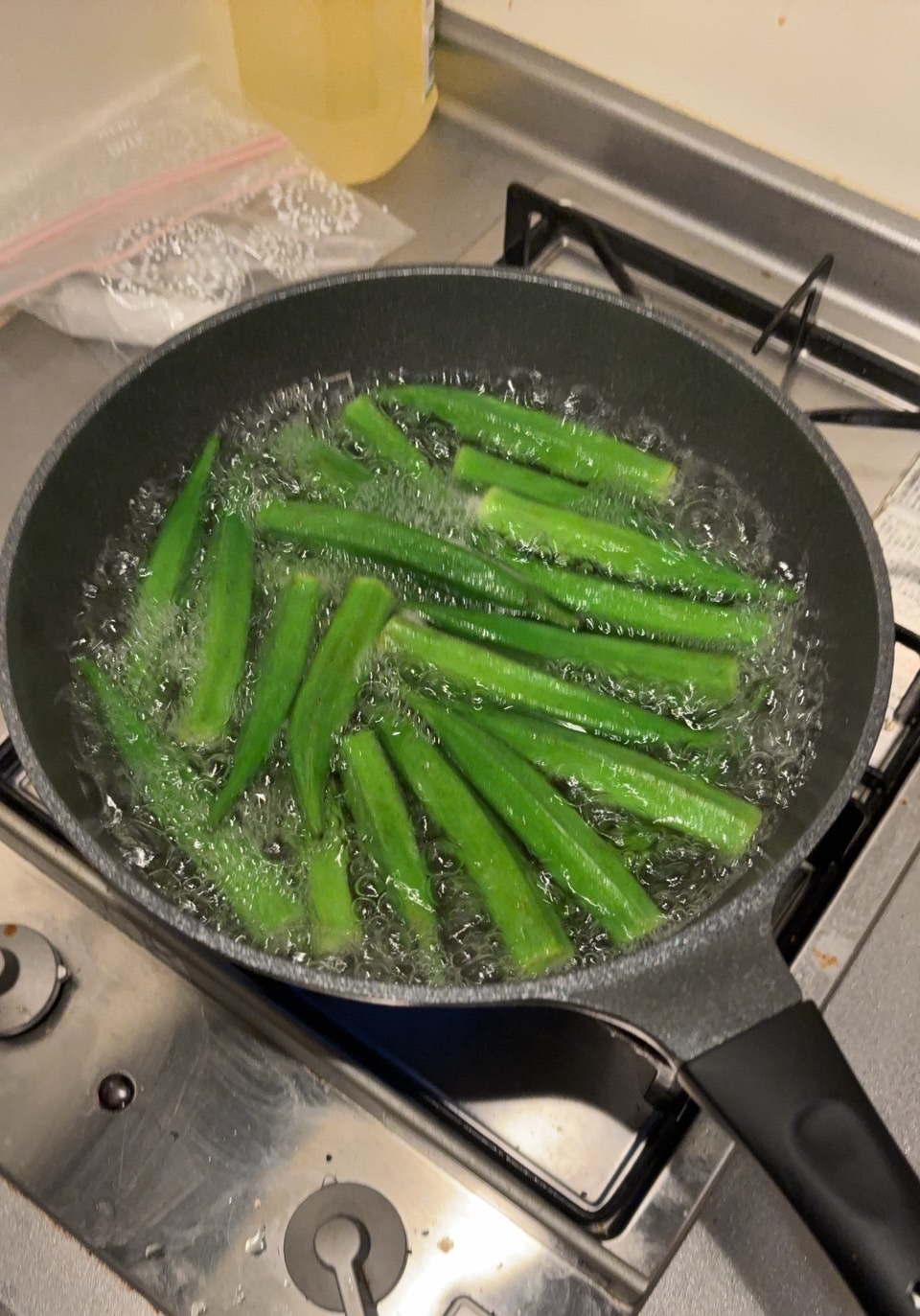 次にオクラをさっと茹で、あまりの美味しそうな見た目に我慢できず、茹でたてに軽く塩を振って、2〜3本つまみ食いしてしまいました。これがまた、絶妙な塩加減で最高の前菜に。