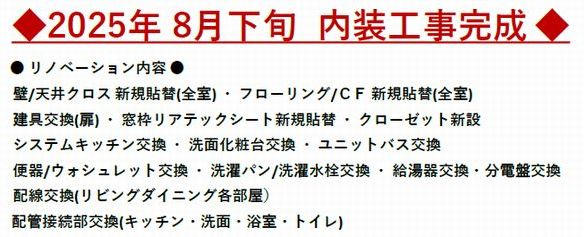 | コメント/周辺施設 | ★10階建て2階部分 南東角部屋 東向きバルコニー ペット飼育可(規約有り) 令和7年8月下旬リフォーム完成★ ・ライフ 阿波座駅前店2分 ・コンビニ2分 ・靱公園5分 ・江戸堀公園4分 ・靱幼稚園10分 ・明治小学校8分 ・花乃井中学校7分 ・住友病院12分 ・三井住友銀行5分 ・西郵便局3分 ・江戸堀図書館5分 ・靱テニスセンター9分 ・阿波座センタービル5分 ・西区役所11分【組合費/月額300円】 |