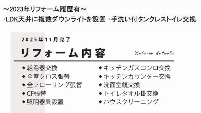 令和5年にリフォーム歴があり、さらに令和7年11月7日にもリフォーム完成しましたので非常に綺麗な状態で生活がスタートできます。