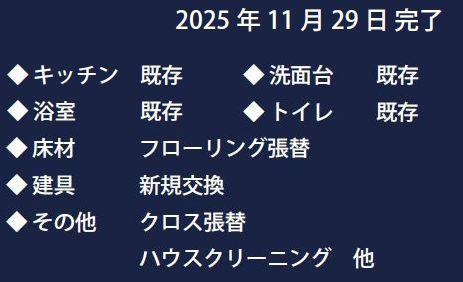 令和5年5月にフルリフォーム歴があり、比較的綺麗なお部屋で、令和7年11月にはクロスやフローリングの張替えなど追加リフォームも完成しており、引き渡し後はすぐにお住い頂けます。