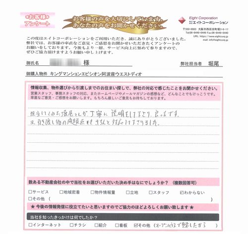 251|M 様 キングマンションエピシオン阿波座ウエストディオ 担当:堀尾